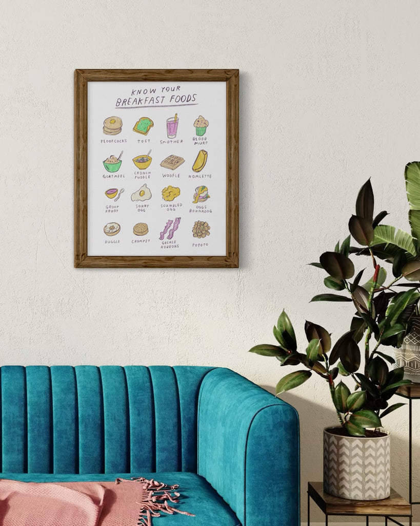 Proper breakfast vocabulary is a vital part of life. This print will help you keep the proper names straight, otherwise you might mix up your grease ribbons from your cronch puddles next time you’re out brunching.