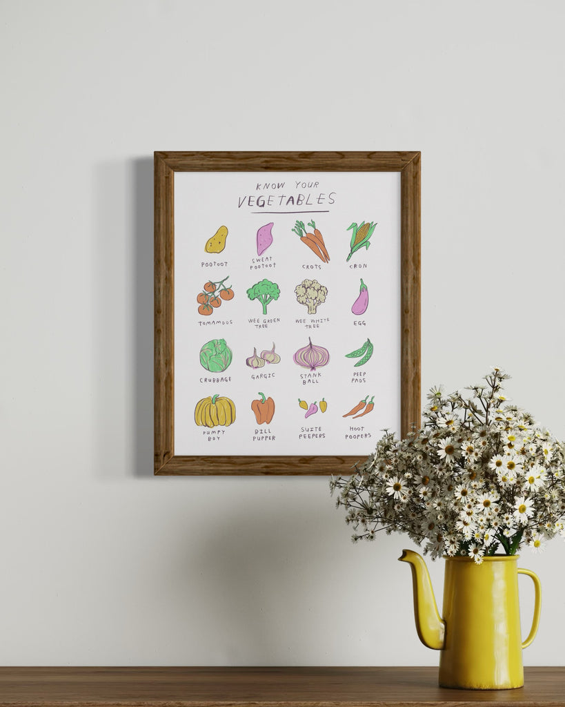 At last! A handy guide to vegetables that you can hang in your kitchen to assure you’ll never mix up your crons and crots again.