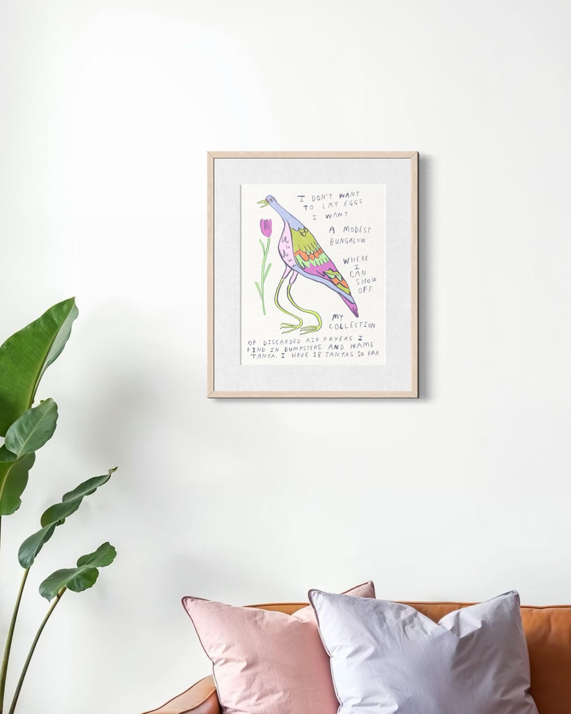 Surreal drawing of a bird with a long neck and legs and a flower. Caption that reads “I don’t want to lay eggs I want a modest bungalow where i can show off my collection of discarded air fryers I find in dumpsters and name Tanya. I have 18 Tanyas so far.” The bird is a multicoloured illustration by Canadian illustrator Heather Buchanan.