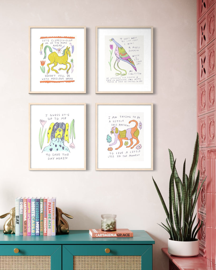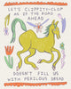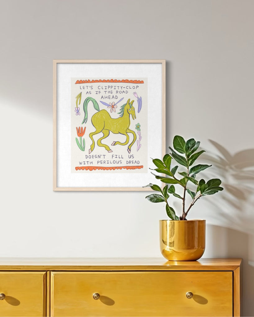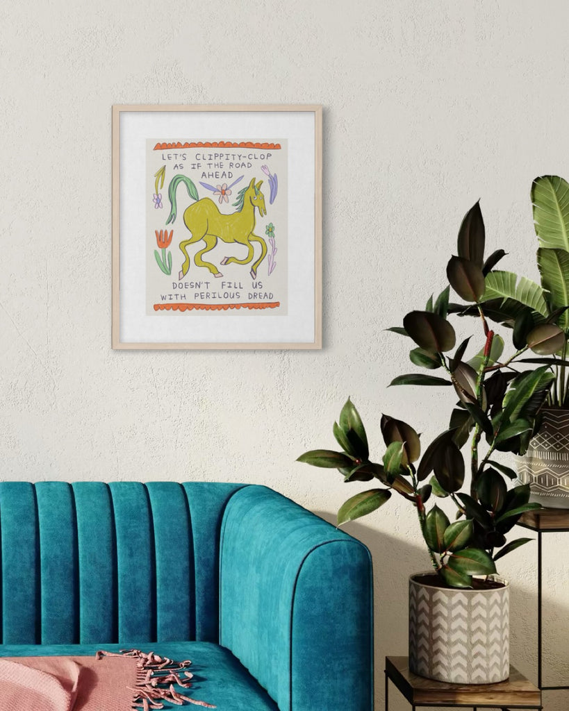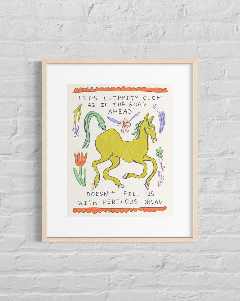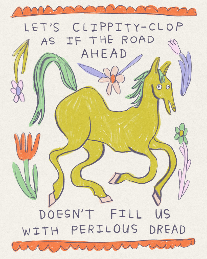 Drawing of a yellow horse with a many wonky flowers and a red frilly border. Caption that reads “Let’s clippity clop as if the road ahead doesn’t fill us with perilous dread.” Horse comic illustration by Canadian illustrator Heather Buchanan.