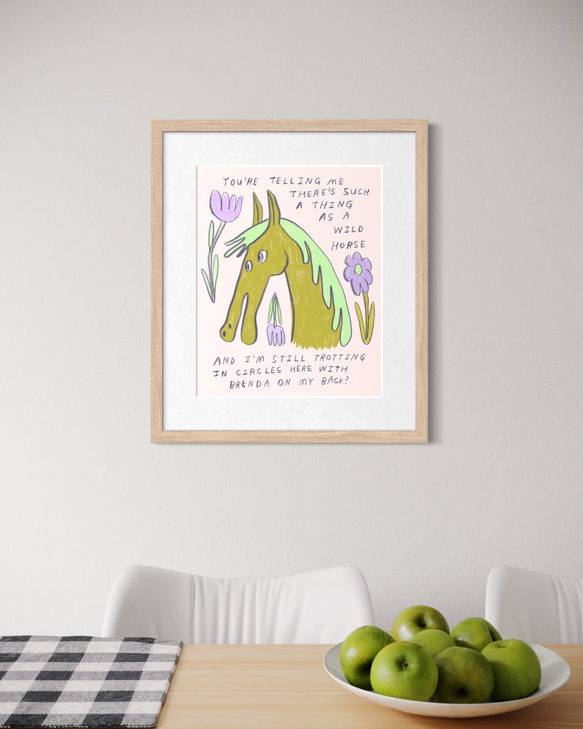 Drawing of a yellow horse with a green mane and purple flowers. Caption that reads “you’re telling me there’s such a thing as a wild horse, and I’m still trotting in circles here with Brenda on my back?”. Horse comic illustration by Canadian illustrator Heather Buchanan.