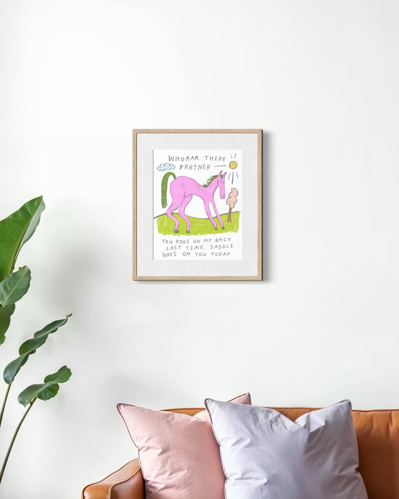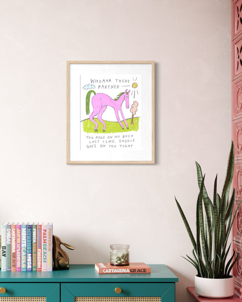 Drawing of a pink horse. Caption that reads “Whoaaaa there partner, you rode on me last time, saddle goes on you today.” Horse comic illustration by Canadian illustrator Heather Buchanan.